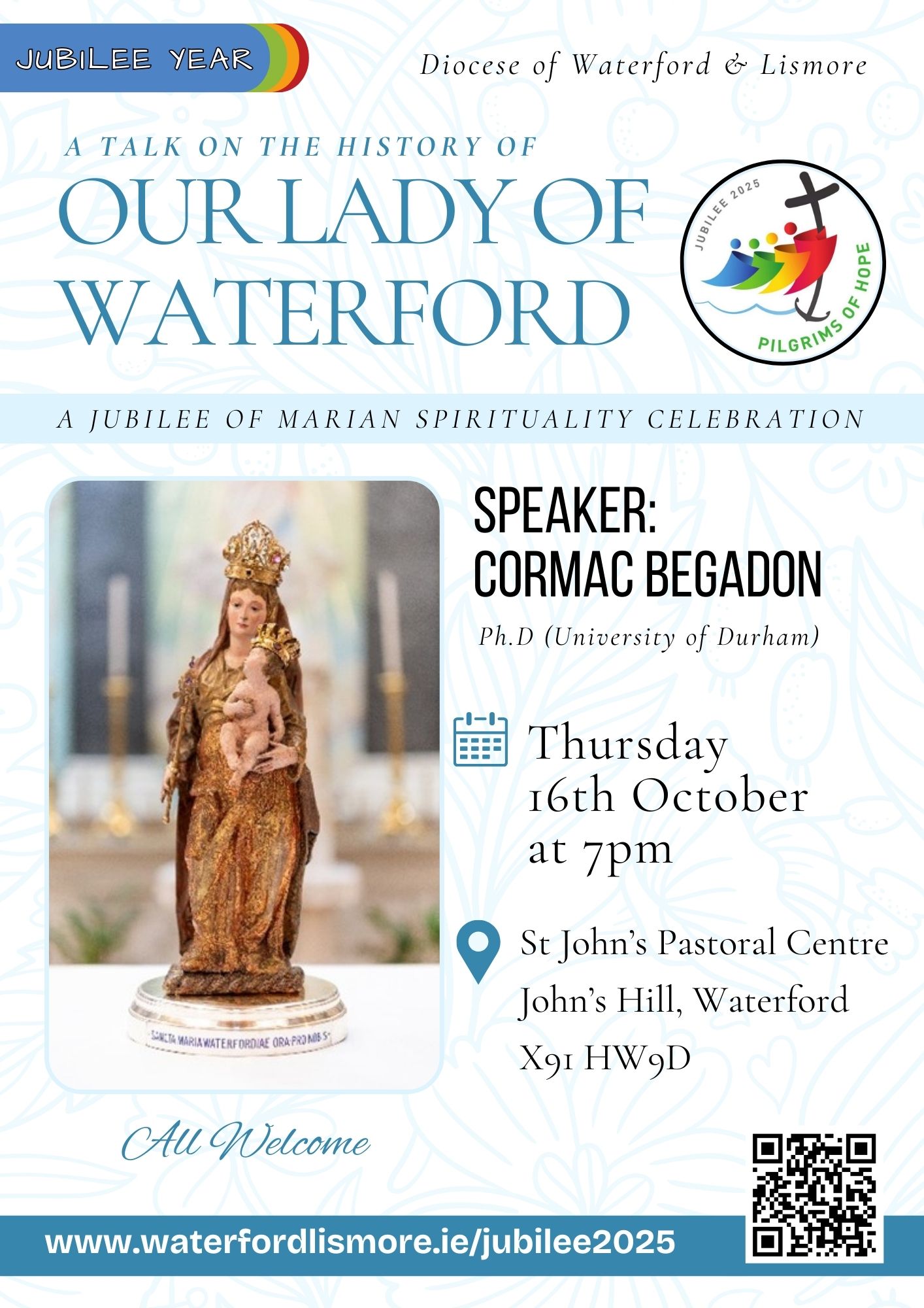 - Jubilee of Marian Spirituality: A Talk on the History of Our Lady of Waterford: St John’s Pastoral Centre, Waterford on 16th October at 7pm