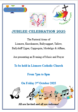 Jubilee Celebration: Evening of Prayer and Music: The Pastoral Areas of Lismore, Knockanore, Ballysaggart, Tallows, Ballyduff Upper, Cappoquin, Modeligo & Affane are presenting an Evening of Music and Prayer – Lismore Catholic Church, Friday 3rd October from 7pm – 8pm. All are invited and all are welcome!