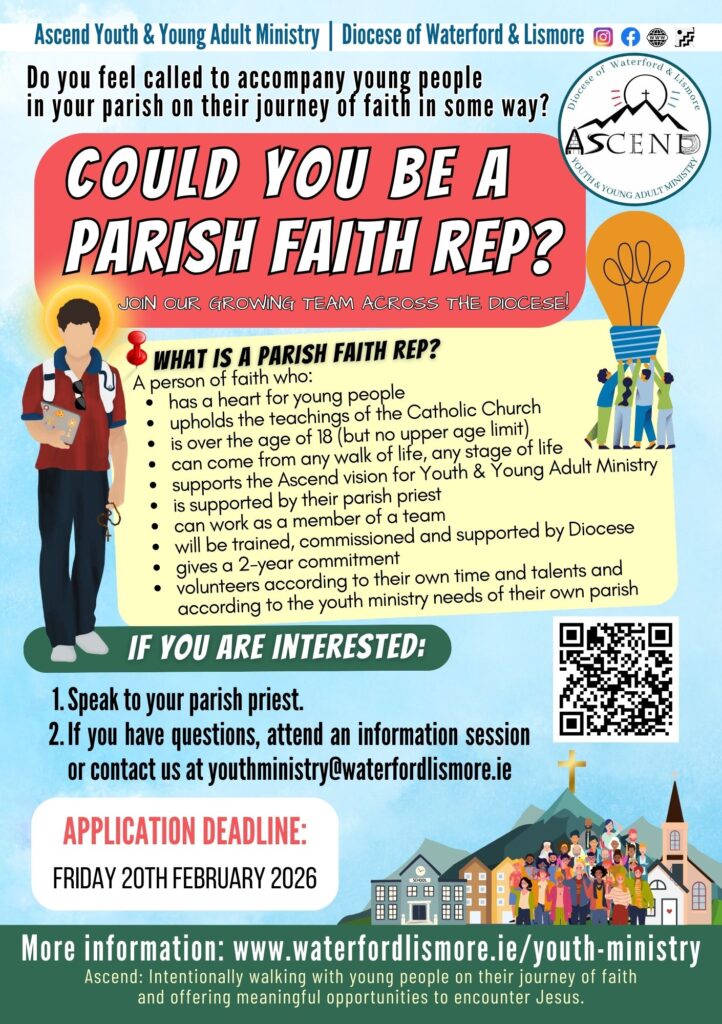 More information on the role and the application and training process can be found on https://waterfordlismore.ie/parish-faith-reps/ Information sessions will be held at St John’s Pastoral Centre, John’s Hill, Waterford on 4th February @7.30pm and on Zoom on 12th February at 7pm.